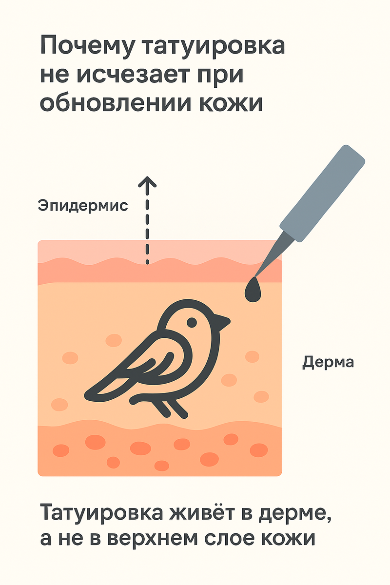 Гиподерма — слой подкожного жира, где кожа «сцепляется» с мышцами и другими тканями. Татуировка «живет» не в верхнем слое, а именно в дерме. И это ключ к разгадке. Во время работы тату-машинка прокалывает кожу иглой десятки и сотни раз