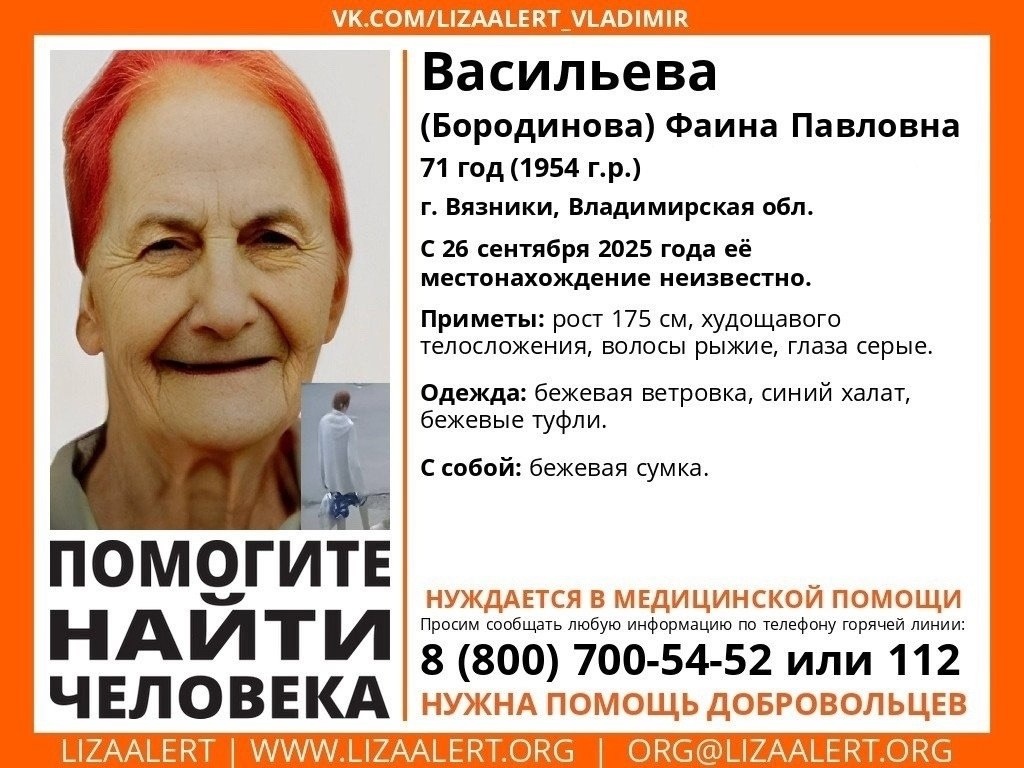 #Внимание! Помогите найти человека! #Максимальный_репост Пропала Васильева (Бородинова) Фаина Павловна 1954 г.р. (71 год), г. Вязники, Владимирская обл. С 26 сентября 2025 года её местонахождение неизвестно. Нуждается в медицинской помощи! Приметы: рост 175 см, худощавого телосложения, волосы рыжие, глаза серые. Была одета: бежевая ветровка, синий халат, бежевые туфли. С собой: бежевая сумка. Инфорги: Пума (Евгения) 89209194945, Ангел (Ангелина) 89302206842 Тема на форуме: clck.ru/3PRjoQ