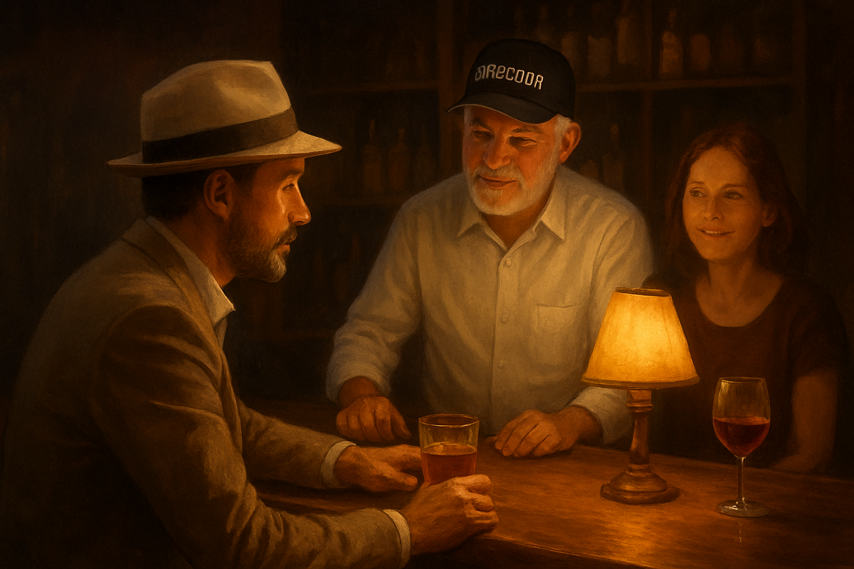 Вечер продолжался своим чередом. Бар был погружён в полумрак, янтарный свет лампы расплывался на стойке. Запах виски и лимона смешивался с морским воздухом. Бармен наклонился ближе, его белая рубашка чуть отсвечивала в темноте, глаза блестели недоверчиво-добродушной хитрецой.