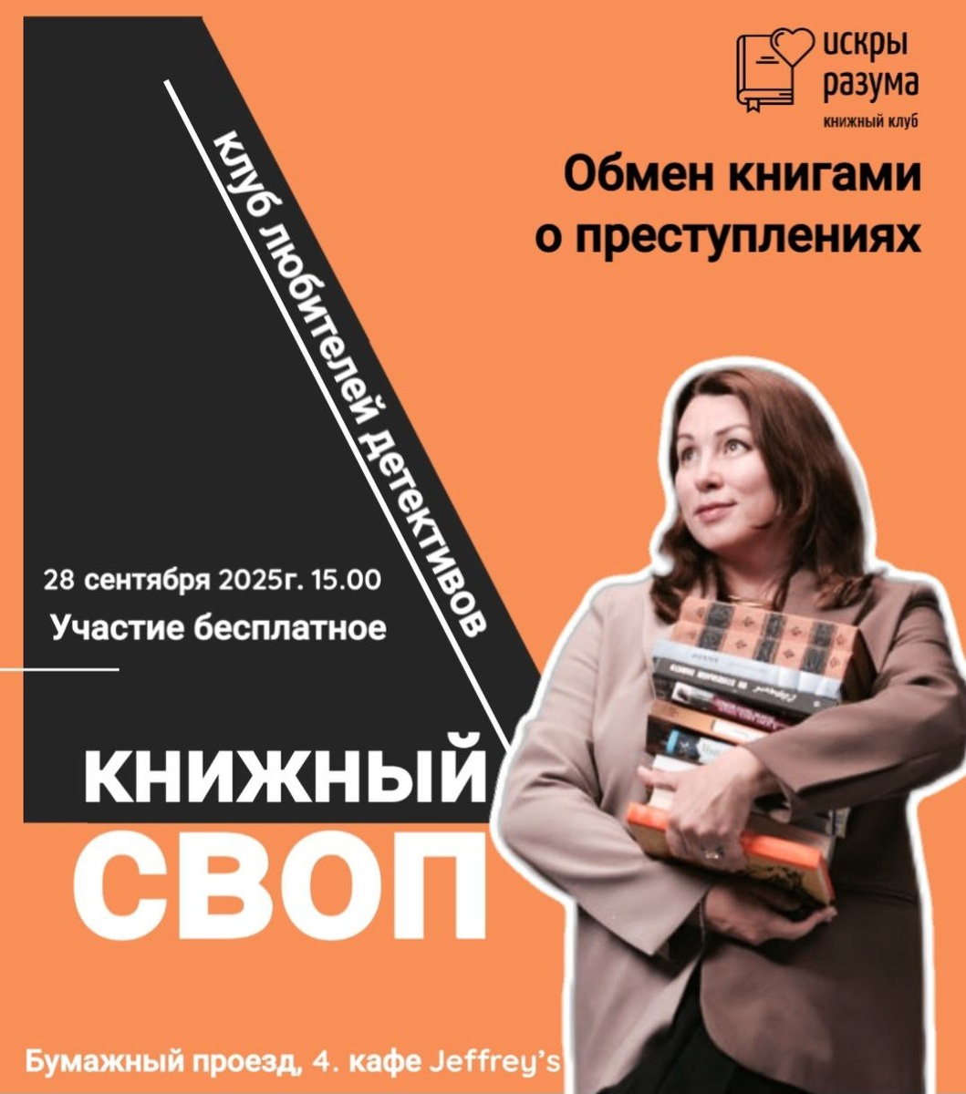 Что вы делаете в воскресенье? Давайте увидимся в Клубе любителей детективов! 📚Своп книг «Клуб любителей детективов» 🚩28 сентября в 15:00 📍Бумажный проезд, 4, кафе Jeffrey’s (2 этаж). 📒Бесплатно ➡️Регистрация Сможете обменяться книгами о преступлениях. В программе: - Литературные посиделки-обмен мнениями. - Обсудим скандинавские детективы. - Лотерея по входным билетам. Разыграю специальный чай для тех, кто любит интриги расследования Своп — это возможность принести классные книги, которые вы уже не будете читать, но готовы рекомендовать, в хорошем состоянии и взамен взять что-то себе. Вы можете ничего не приносить, или ничего не брать. Что я принесу на своп - смотрите в комментариях. Иду меняться книгами Иду на детективный своп Иду меняться книгами ⭐⭐⭐⭐⭐⭐⭐⭐⭐⭐ @iskry_razuma #кудаходить #анонс #своп #свопмосква