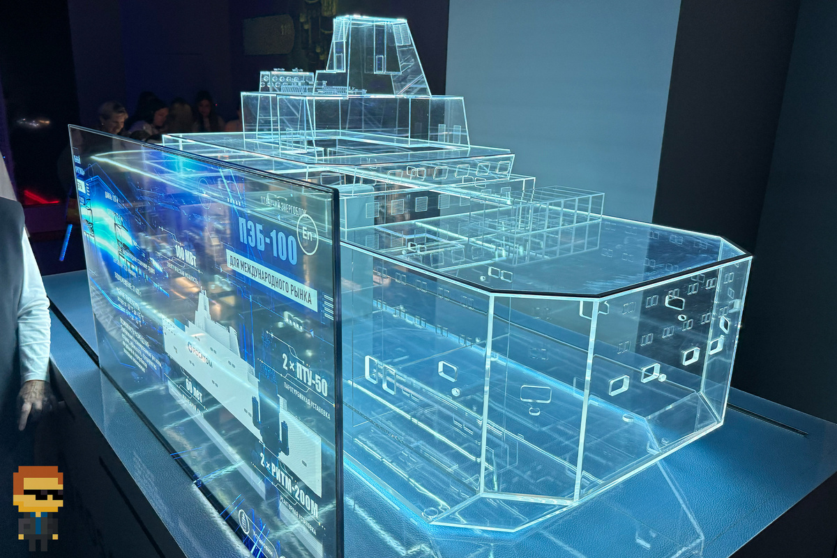 1) В выставочной зоне представлен макет плавучего энергоблока (ПЭБ) с новейшими реакторными установками серии РИТМ, который разработали для зарубежного рынка. Можно детально ознакомиться с расположением основных элементов ПЭБ – реакторной и паротурбинной установками. Также показали линейку плавучих энергоблоков, созданную с учетом различных климатических и географических особенностей потребителей. Именно наличие макета позволяло представить себе весь масштаб проекта.