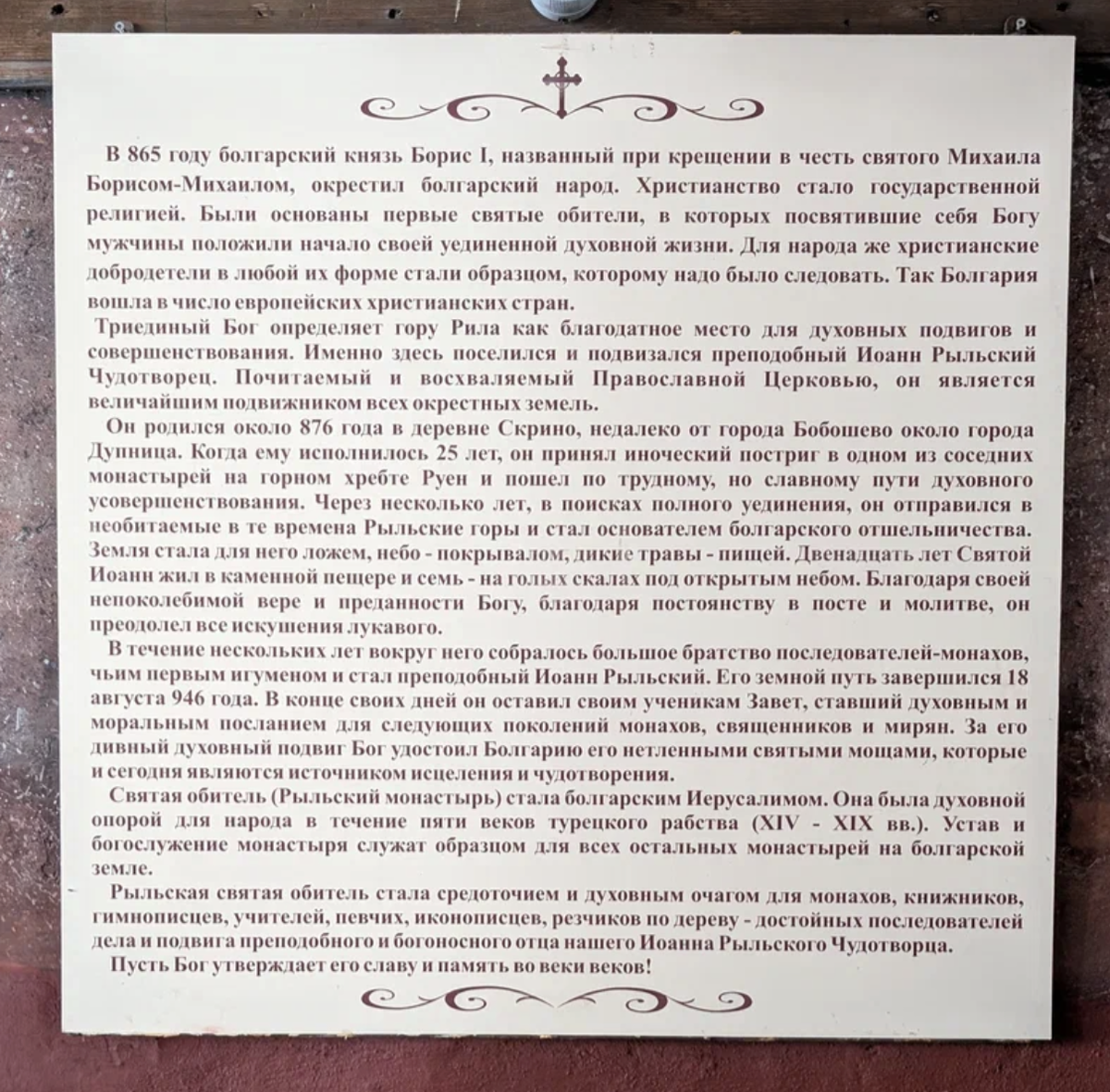 Одна из самых распространенных экскурсий из Софии - это поездка в Рильский монастырь. Она занимает почти целый день, но сильно не напрягает. Стоит такая поездка 30 евро на месте (и по-английски) и 40 евро через Трипстер. Дорога - хорошее шоссе, ехать приятно. Вокруг - гористая местность, постоянно меняющийся интересный пейзаж, поэтому за 2 часа не успевает наскучить. Рильский монастырь - действующий, но монахов в нем сейчас всего 6, то есть жалкие остатки от бывшего величия. Однако народа сюда едет много. Кто-то хочет приложиться к мощам Иоанна Рильского, а остальная часть - просто туристы. Но стоит ли сюда ехать туристом, что вы тут увидите? История монастыря достаточно длинная: Но он много раз перестраивался, поэтому смотрится не старым и потрепанным, а очень даже ухоженным. Монастырь окружен высокой стеной, для посетителей открыты ворота: Посетителей просят прилично одеться: Через ворота гости монастыря попадают во двор неправильной формы, в центре которого стоит собор: А по пе