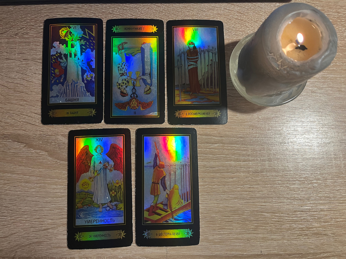 Здравствуйте! Сегодня мы сделаем расклад про отношения на тему: уходить или остаться? Расклад на 5 карт: 1) ситуация сейчас, 2) чувства партнера, 3) твои внутренние установки, 4) совет, 5) возможный исход, если следовать совету. Итак, открываем карты: Краткая интерпретация: • Башня (ситуация сейчас): в отношениях произошёл (или происходит) сильный перелом, разрушение иллюзий, резкие события или обострения, которые заставили всё переосмыслить. Это не «мелкие ссоры» — энергия разрушения указывает на необходимость перемен или корректировки основ. • Двойка Кубков (перевернута) (чувства партнёра): связь ослабла, есть недопонимание, дистанция или потеря доверия/интереса. Партнёр может быть закрыт эмоционально или не готов к искреннему сближению сейчас. • Восьмёрка Мечей (твои установки): ты чувствуешь себя в ловушке — бессилие, страх сделать шаг, сомнения. Часто это больше про внутренние барьеры, чем про объективную невозможность уйти или остаться. • Умеренность (совет): ищи баланс, медленн