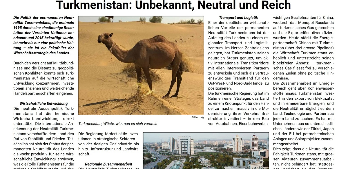 ЖЕНЕВА, 27 сентября. /ИА ORIENT/. Швейцарское издание «UZ» (Umwelt Zeitung) опубликовало аналитический материал «Turkmenistan: Unbekannt, Neutral und Reich» («Туркменистан: независимый, нейтральный и богатый»), в котором подчеркивается, что постоянный нейтралитет страны является не просто политической позицией, а краеугольным камнем её экономической стратегии.