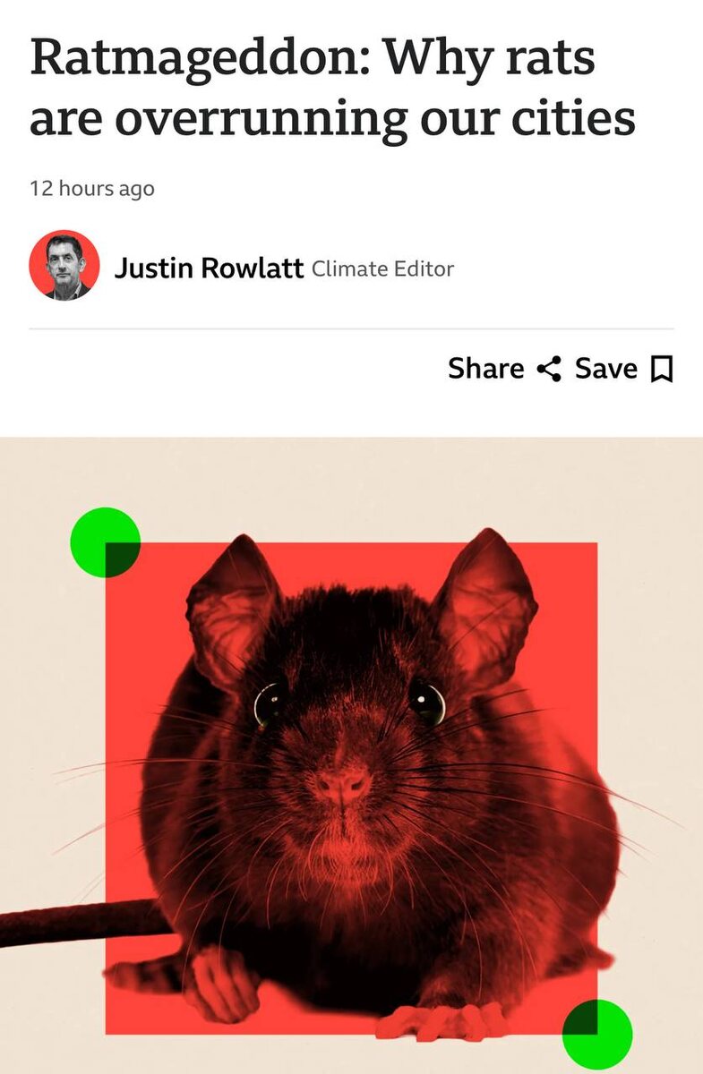 «Крысогеддон». В Британии и США началось нашествие крыс. Крупные города Британии и США столкнулись с резким ростом популяции крыс, сообщает BBC. Это вызывает серьезное беспокойство у жителей. По данным британских служб дератизации, количество обращений за помощью за последние годы увеличилось на 20%, численность грызунов варьируется между тем от 10 до 120 млн. Аналогичная ситуация в США: за последние 17 лет популяция крыс выросла на 400% в Вашингтоне, на 300% – в Сан-Франциско и на 160% – в Нью-Йорке. ⭕️ Подписаться | Мы в MAX | Буст