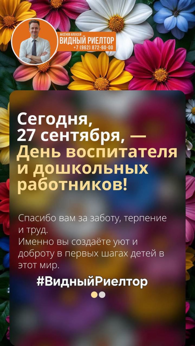 Доброе утро, мои дорогие! Сегодня, 27 сентября, мы отмечаем особенный и важный праздник — День воспитателя и всех работников дошкольных учреждений! 🌸 Хочу сказать огромное спасибо всем воспитателям, няням, педагогам и всем, кто каждый день дарит нашим малышам заботу, внимание и тепло. Вы — настоящие волшебники, создающие уют и доброту там, где начинается их первый шаг в большой мир. Как риелтор, я точно знаю: дом становится уютным, когда рядом есть надежные и заботливые люди. В детском саду именно вы, воспитатели, становитесь для наших детей теми самыми «близкими людьми», дарящими ощущение тепла, безопасности и радости. Пусть ваша работа всегда приносит вам радость, а каждый день будет наполнен улыбками детей и благодарностью родителей. С праздником вас, дорогие воспитатели! 🌸 И немного о себе. Я — Видный Риелтор. Если вы хотите приобрести или продать участок, коммерческую или жилую недвижимость, я всегда готов помочь! Свяжитесь со мной, и мы вместе найдем идеальное решение д