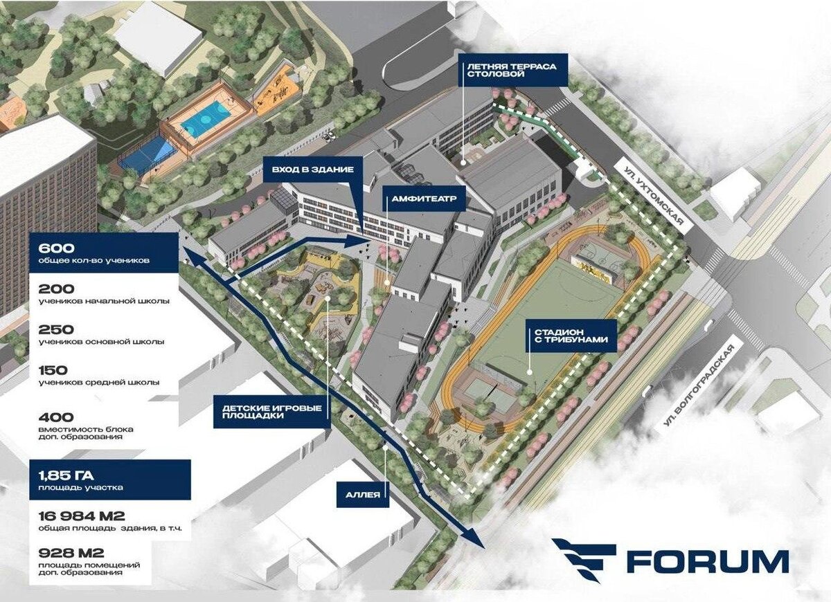 Обновленное пространство парка будет граничить с территорией двора жилого квартала Forum Park, а также его соединят пешеходной аллеей с территорией новой гимназии № 116. Новое здание гимназии вместит IT-полигон, амфитеатр и классы-трансформеры, современные пространства для учёбы и спорта. Всего в нем будут учиться 600 человек.