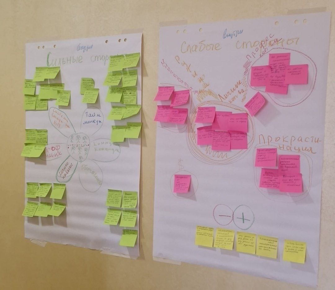 Помимо прогулок по Красной Поляне - работаем в тренинговом формате. Вчера собирали сильные и слабые стороны команды. Большой акцент ушёл на личностные качества - системность, таймменеджмент, профессионализм, мешают - неуверенность, тревога, многозадачность. Оказалось что и все разные, а сложности похожие. Сегодня разбираем возможности и угрозы.