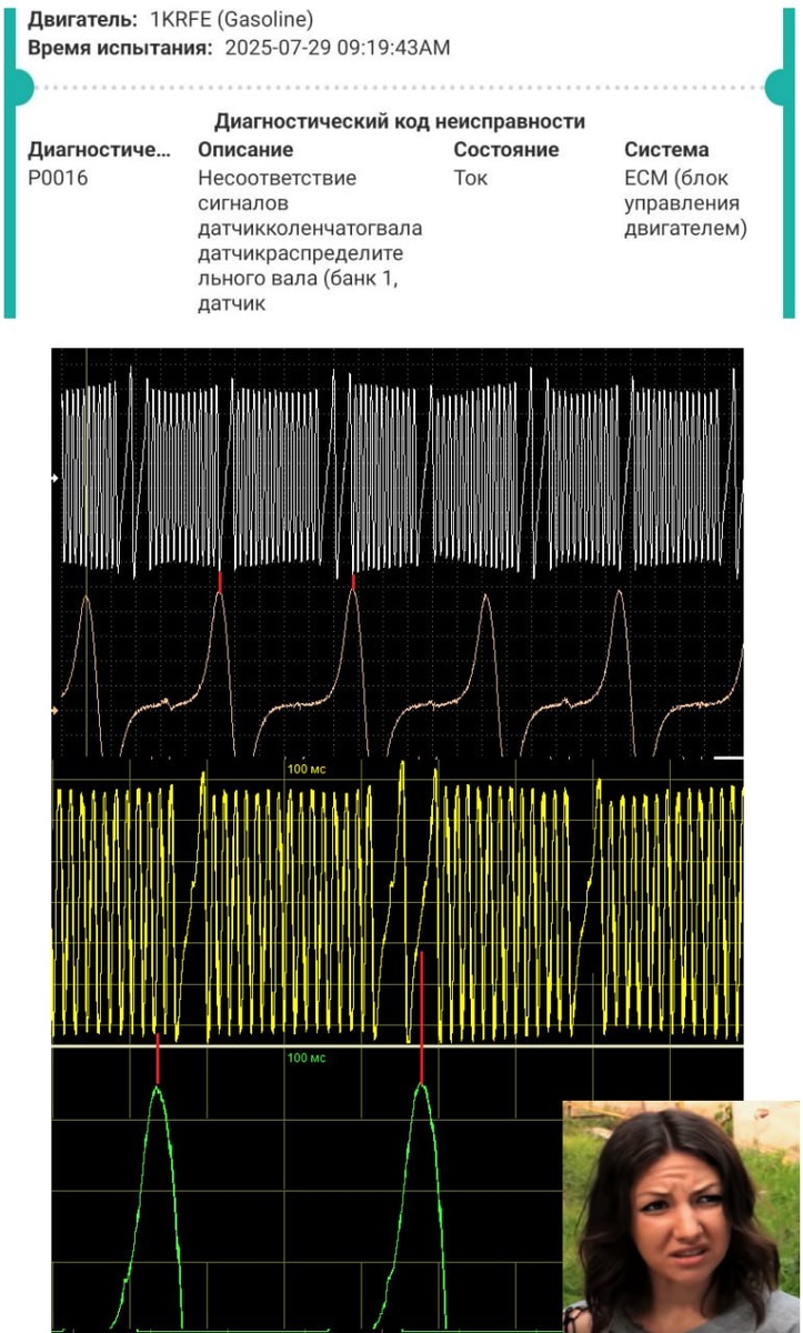 Toyota Vitz, 2009 год, аккуратная, довольно целая машина с пробегом чуть больше 100 000 км На борту 1KR-FE - литровый "пакет молока" на 3 цилиндра, который и был заменен на "контрактный" без пробега по России, т.е. с пробегом помемсче (сколько точно нам не сказали)🫠 Продавец дал месяц гарантии! У хозяйки почти сразу загорелся чек, на что сервис, который продает и устанавливает двигатели сказал заменить датчик положения коленвала! Датчик заменен, но ошибка на месте: P0016 Несоответствие сигналов датчика коленвала и датчика распредвала!🫡 Что означает - растяжение цепи ГРМ. На типа новом двигателе🙀 Хозяйка так прокаталась месяц, гарантия ушла и она приехала к нам, где я снял осциллограмму синхронизации и подтвердить ошибку графиками🤓 Верхний график - Эталонный, нижний - снятый с пациента. Отметил для любознательных красной вериткальной линией куда смотреть🤓 В итоге заменили цепь и двигатель теперь троит ровно!