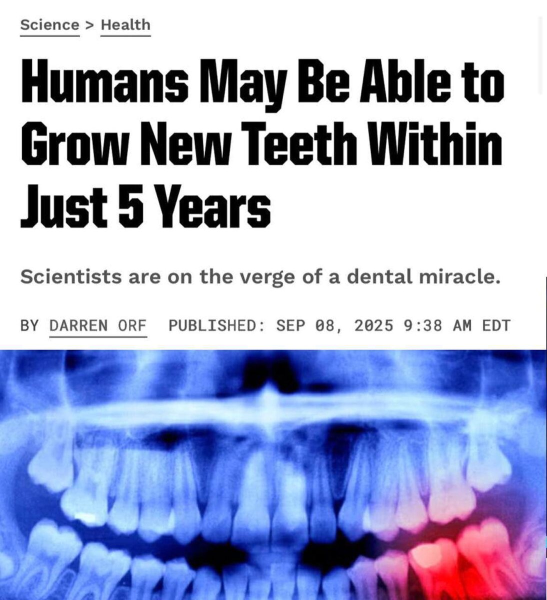 🦷 Проблемы с зубами? Можно вырастить новые! Ну или скоро можно будет: японские учёные тестируют волшебный препарат. Исследователи утверждают,что научились влиять на ген USAG-1, блокирующий рост зубов. Лекарство прошло первые этапы проверки, но впереди ещё много тестирований. 📌 Подписаться на Москва FM / Наш чат-бот / Мы в MAX