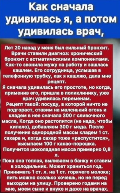 На картинке описан «народный рецепт» от хронического бронхита: смесь сливочного масла, мёда, сахара и какао, которую принимают с горячим молоком. Разберём по сути: ❌ Нет. Хронический бронхит (особенно с астматическим компонентом) связан с воспалением и сужением дыхательных путей. Здесь нужна медикаментозная терапия: бронхолитики, противовоспалительные препараты, иногда антибиотики (по показаниям), плюс исключение причин (курение, аллергены, пыль и т.д.). ✅ Да. Тёплое молоко с мёдом и маслом: Но это симптоматическая помощь, а не лечение болезни. 🔑 Вывод: История из картинки выглядит как «народное чудо-средство», но оно не может вылечить хронический бронхит. Максимум — временно облегчить кашель. Основное лечение должен назначать врач.