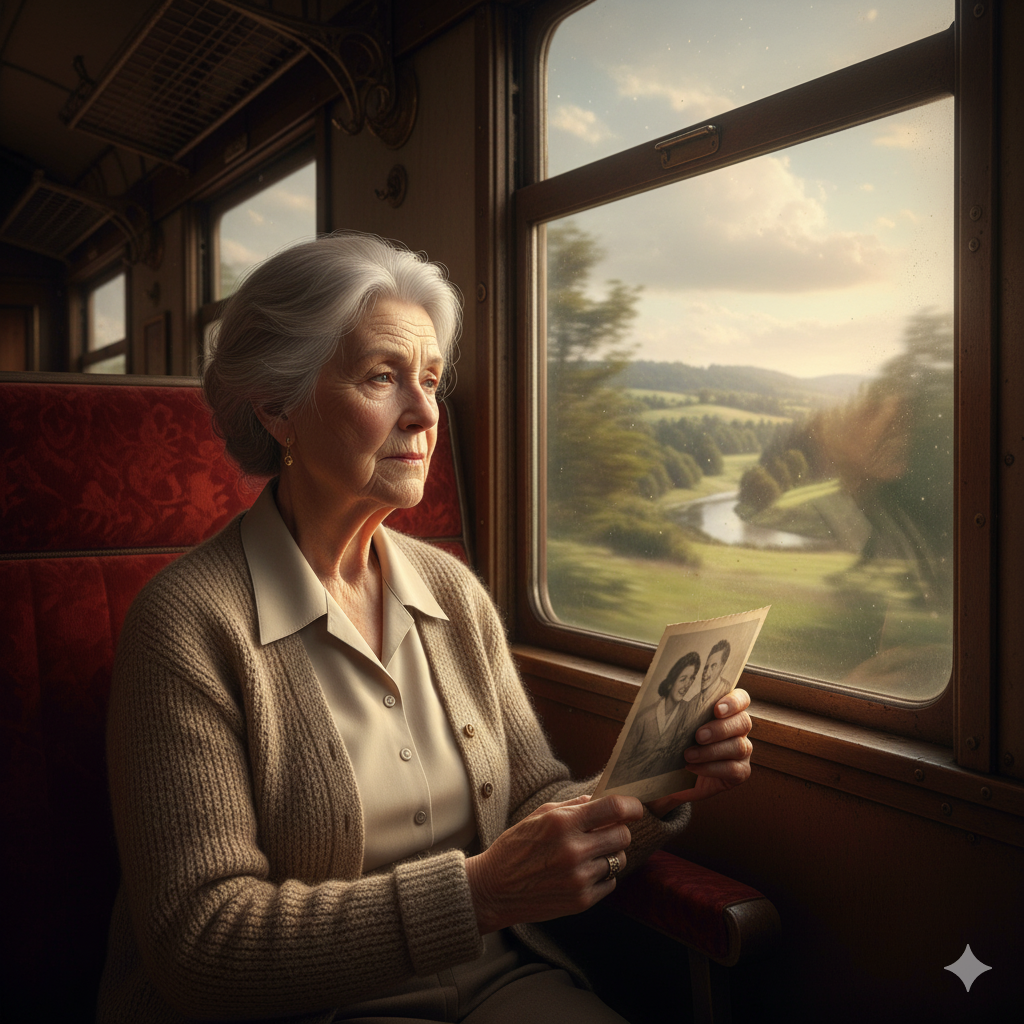 [Изображение пожилой женщины в поезде со старой фотографией]