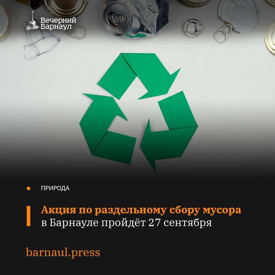 Сегодня, 27 сентября, на территории Барнаула пройдёт акция по раздельному сбору вторсырья. Стационарная точка в этот день разместится в Парке спорта Алексея Смертина на Энтузиастов, 12в с 12:00 до 15:00. 📍Будут и мобильные маршруты. Маршрут №1 🔸10:00 — 10:40 — улица Чайковского, 19 в посёлке Южном; 🔸10:55 — 11:20 — Змеиногорский тракт, 104п/1; 🔸11:35 — 12:20 — ТРЦ «Гулливер» на проспекте Красноармейском, 51а; 🔸12:35 — 13:00 — «Семейный Бигс» на Красноармейском, 131. Маршрут №2 🔸10:00 — 10:40 — проспект Энергетиков, 10 (ЖК «Времена года»); 🔸10:50 — 11:30 — площадь Адмирала Кузнецова на Балтийской, 53; 🔸11:40 — 12:10 — площадка между домами №9 и №15 на улице Взлётной (квартал 2000); 🔸12:25 — 12:50 — магазин «Новэкс» на Малахова, 62; 🔸13:05 — 13:25 — улица Телефонная, 54. 📌 Подробнее о прохождении акции читайте на нашем сайте. Фото: freepik.com @barnaul
