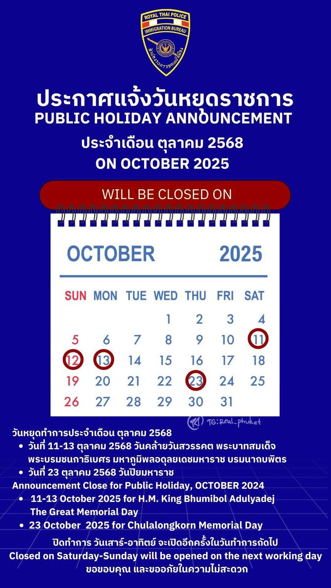 Праздничные дни в иммиграционных офисах Пхукета в октябре. Учтите что в эти дни госучреждения как правило закрыты. Планируйте продления виз заранее! @real_phuket