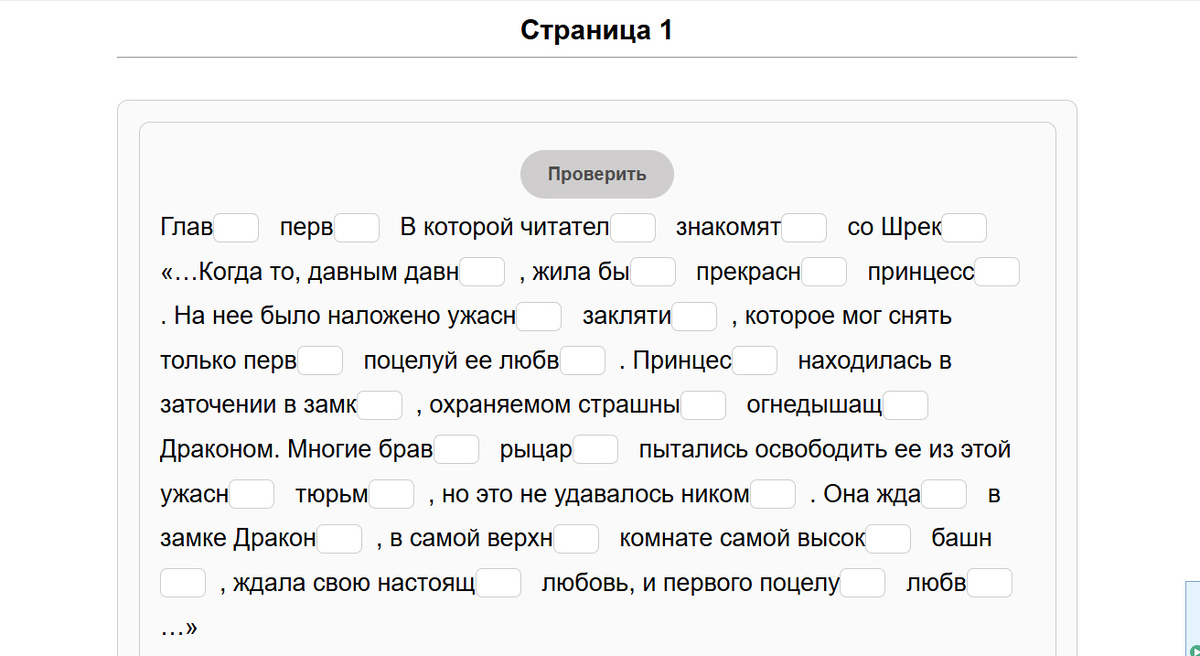 Миг (773). Я смогла реализовать приложение на основе упражнения "вставьте окончание" в книге "Шрек". Я писала об этом ранее, как о пособии. И да, Гриша более полугода делал это упражнение в книге. Один день, одна страница. Читаешь, вставляешь окончания. Но проблема книги в том, что нужен человек над душой. Кто тебе скажет, что ты верно вставил? Да... человек. Идея убрать человека не покидала мою голову с момента, как я начала создавать простые приложения. И вот я смогла сделать и более сложное. И сегодня была премьера. Перед Гришей целая страница текста. Это важно. Потому что просто упражнения типовые он делать может. А вот текст - это уже на много сложнее. И там не только и не столько окончания, сколько конец слова. Гриша должен написать, нажать на кнопку проверить. Правильные ответы подсветятся зелёным, неправильные красным. И можно исправлять, пока все не станут зелёными. Тут очень важный момент, который касается исключительно Гриши. Он не запоминает и не понимает правил,