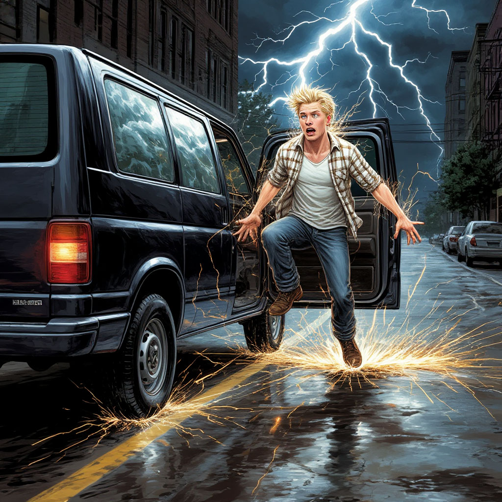 На экране медленно проезжал темный фургон. Камера автоматически сфокусировалась, как только тот резко затормозил. И вдруг - яркая вспышка молнии внутри. Окна замелькали. Летят искры. Дверь открывается, и оттуда буквально вываливается мужчина. Блондин. Высокий, с острыми чертами лица. Одет в простую фланелевую рубашку, джинсы, ботинки. Перепуган до края. Молнии вырываются из его рук, плеч, даже глаза кажутся затуманенными электричеством. Он падает на колени на мокрый асфальт и именно в этот момент рядом проезжает такси, которое получает прямой удар. Еще одну машину заносит.