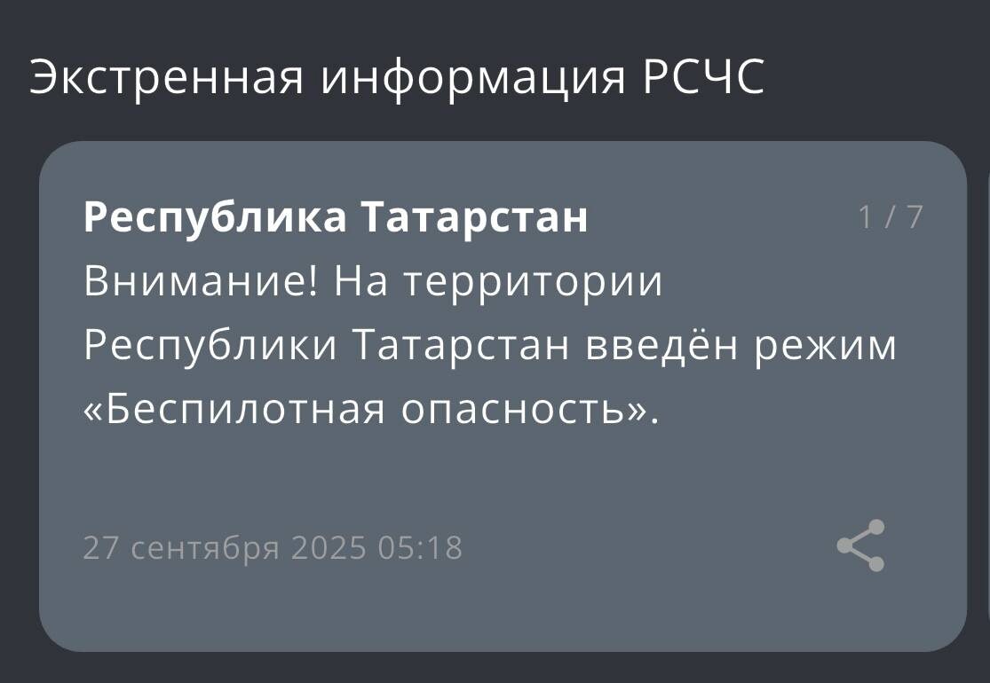 В Татарстане с 5:18 действует режим «Беспилотная опасность». 🌟 Татарстан News в MAX