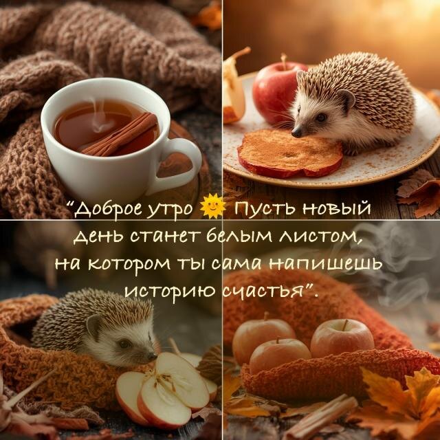 ●▬▬▬▬๑۩۩๑▬▬▬▬▬● Доброе утро ☀ Каждый новый рассвет — как чистая страница. Ты сама выбираешь, что на ней написать: улыбку, мечту, шаг вперёд или объятие близкого человека. Пусть сегодняшний день станет историей счастья, сотканной из мелочей: аромата чая, тепла пледа, шороха осенних листьев и даже маленьких радостей вроде взгляда ёжика 🦔✨ ●▬▬▬▬๑۩۩๑▬▬▬▬▬●