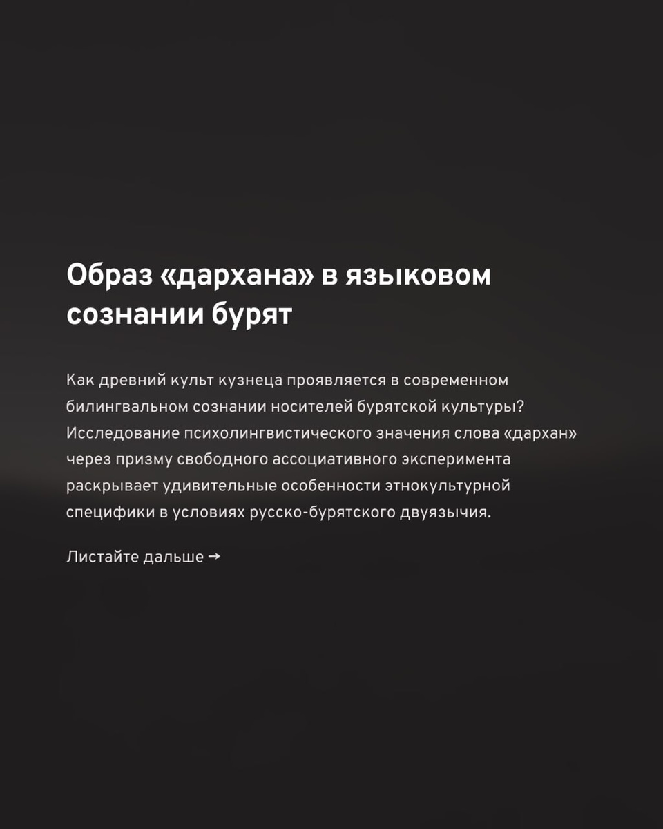 Образ «дархана» в языковом сознании бурят Как древний культ кузнеца проявляется в современном билингвальном сознании носителей бурятской культуры? Исследование психолингвистического значения слова «дархан» через призму свободного ассоциативного эксперимента раскрывает удивительные особенности этнокультурной специфики в условиях русско-бурятского двуязычия. Листайте дальше → 📌 Больше о бурятской культуре и истории — в нашем канале 👉 https://t.me/universe_buryat