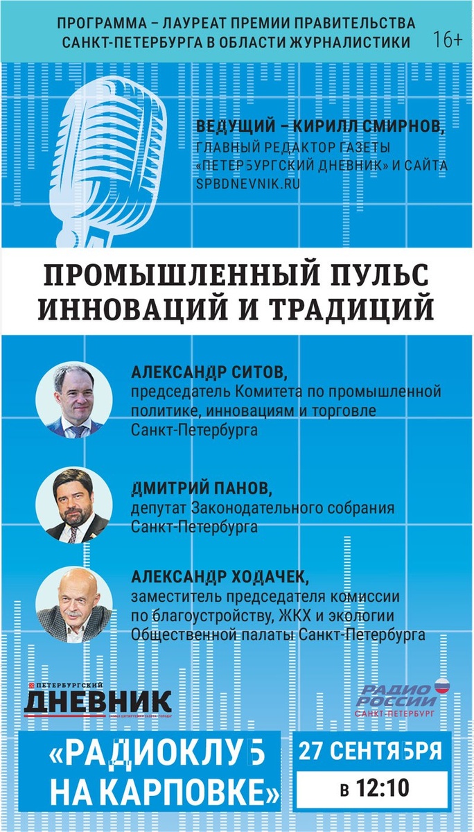 🎙 Сегодня, 27 сентября, в 12:10 на волнах «Радио России» начнется программа «Радиоклуб на Карповке» Гости студии поговорят о том, как новые технологии и проверенные практики формируют развитие промышленности, городской среды и экономики Санкт-Петербурга. Эфир передачи проведет главный редактор газеты «Петербургский дневник» Кирилл Смирнов. Включайте 99.0 FM или слушайте прямой эфир на сайте. Подписаться на Петербургский Дневник в MAX