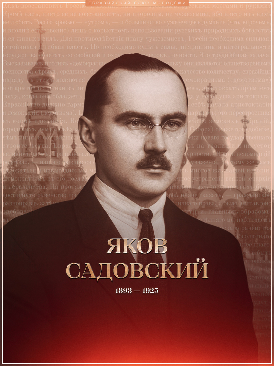Сто лет назад. 27 сентября 1925 г., в день Воздвижения Господня, в возрасте 32 лет в туберкулёзном санатории «Под Плешью» близ Праги скончался Яков Дмитриевич Садовский, один из отцов-основателей евразийства, ближайший соратник и друг Петра Николаевича Савицкого. С тех пор этот день было решено отмечать как День памяти умерших евразийцев, каковую традицию мы торжественно восстанавливаем сегодня. Человеческий и идейный подвиг Якова Садовского, его биография и роль в евразийском движении слишком мало известны даже сейчас и даже в кругу историков-специалистов, не говоря уже о широких массах. До сих пор неизвестна даже точная дата его рождения. Доселе ни одной фотографии мыслителя не было в Интернете или опубликованных книгах, и единственное сохранившееся архивное фото из Государственного архива РФ мы публикуем здесь и сейчас. Опубликованное в 1920-е годы печатное наследие Садовского составляет всего лишь пару сотен страниц, сохранившиеся в архиве его неопубликованные письма Савицкому – менее сотни листочков. Несмотря на эту краткость, вклад мыслителя в евразийство заслуживает обстоятельного рассмотрения.