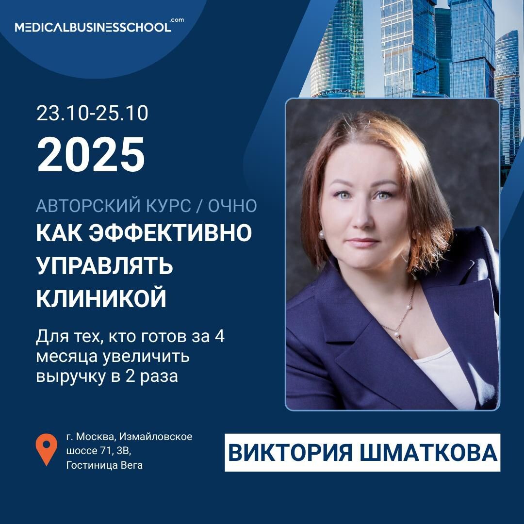 Друзья, Школа Медицинского Бизнеса приглашает вас на обновленный 3-дневный авторский курс «КАК ЭФФЕКТИВНО УПРАВЛЯТЬ КЛИНИКОЙ», который пройдет очно в Москве 🕐 23 - 25 октября 2025 года 📍 Гостиница “Вега”/ г. Москва, Измайловское шоссе 71, 3В ✔ Формат очный 🔥 Для тех, кто готов за 4 месяца увеличить выручку в 2 раза ПОДРОБНОСТИ И РЕГИСТРАЦИЯ ПО ССЫЛКЕ: https://medicalbusinesschool.com/intensive_management Курс направлен на формирование системного подхода к управлению клиникой, на структурирование знаний по ключевым управленческим блокам: операционная деятельность, финансы, право, маркетинг, современные технологии и управление людьми. Остались вопросы? Позвоните нам 8(800)511 88 97