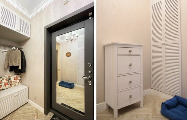 Решения, которые легко повторить и в вашем интерьере Эта квартира — первый проект дизайнера Марии Чикуновой. В интерьере она учла все необходимые нюансы для удобного проживания. Давайте посмотрим, какие решения Мария применила в прихожей. Для отделки стен в прихожей дизайнер использовала декоративную штукатурку. Этот материал достаточно практичен и легко моется. Кроме того, это позволило добавить текстуры и глубины в интерьер. Уникальные фактуры создают интересные акценты, которые делают прихожую стильной и уютной. Чтобы увеличить световое пространство и сделать прихожую более открытой, Мария использовала зеркало на входной двери. Это простое, но эффектное решение существенно улучшает освещение, а также позволяет быстро оценить свой внешний вид перед выходом. Вместо стандартного шкафа, Мария использовала комбинированную систему хранения с несколькими функциональными зонами. Она включает в себя вешалку для верхней одежды, открытую полку, закрытые секции для обуви и других мелочей, а так