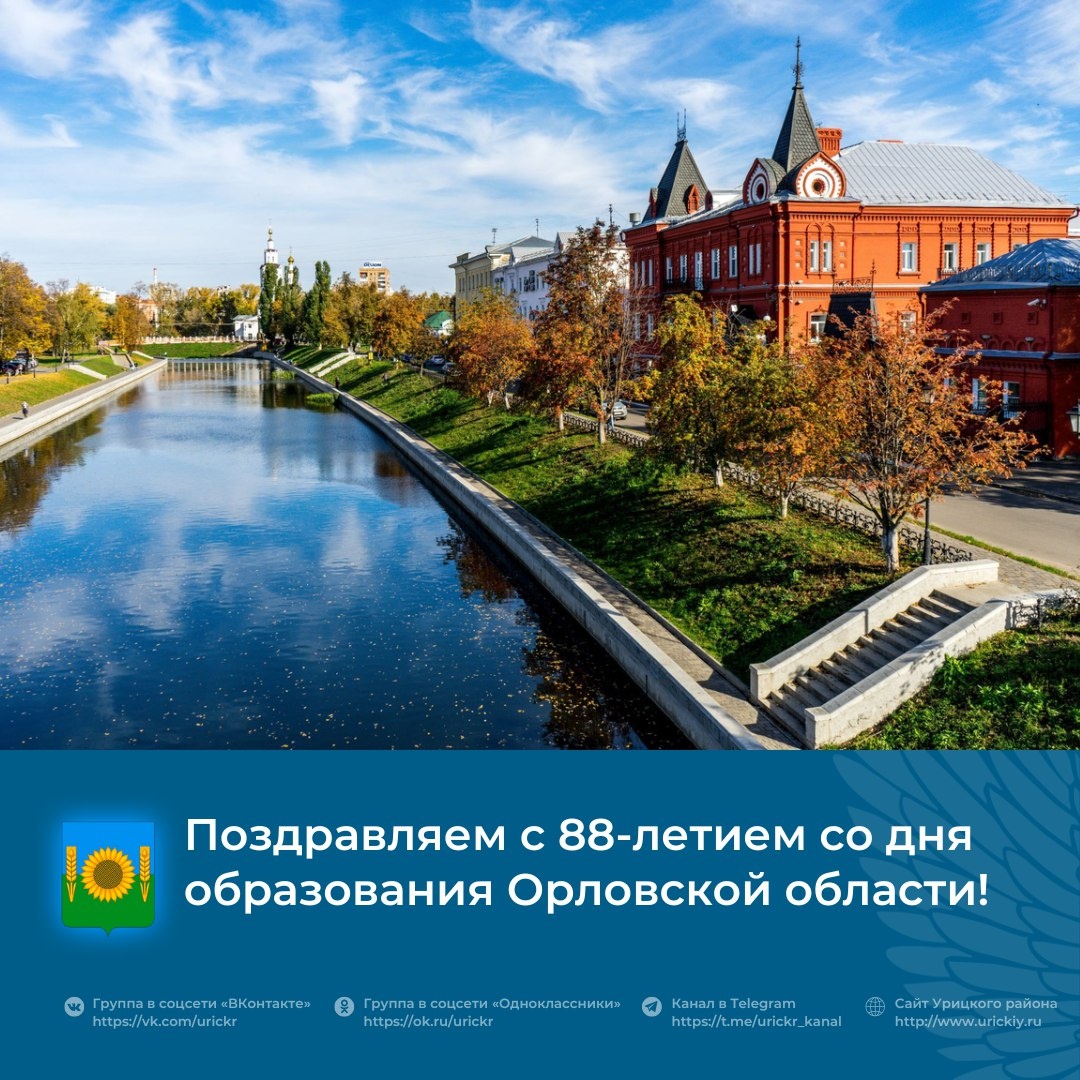 Уважаемые жители Урицкого района! С радостью поздравляем вас с замечательной датой — 88-летием образования Орловской области!🎊