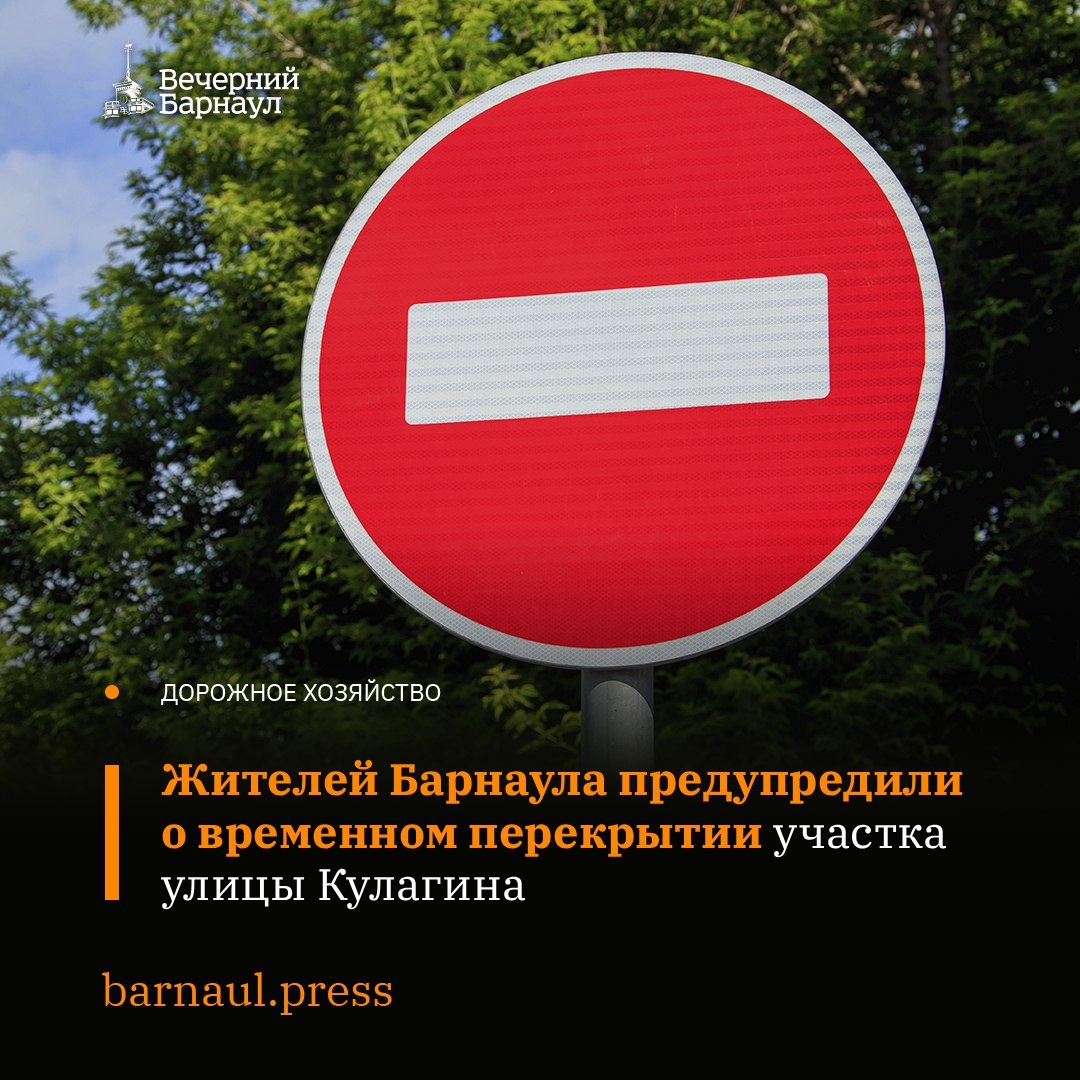 ⛔ Напоминаем, для восстановления благоустройства и дорожного покрытия в Барнауле планируется временно ограничить движение транспорта по улице Кулагина между зданиями №22 и №26. Проехать по вышеуказанному участку будет невозможно: 🔸с 20 часов 27 сентября до 8 часов утра 28 сентября. 📌 В период ограничения планируется также изменить схемы движения автобусных маршрутов №2, 70р, 65, 75, 76. В сторону микрорайона Восточный они отправятся по проспекту Калинина, улицам Ткацкой, Рубцовской, Маяковского, Кулагина, далее по своим маршрутам. В обратном направлении они пойдут по улицам Кулагина, Маяковского, Рубцовской, Ткацкой и проспекту Калинина, затем без изменений. @barnaul