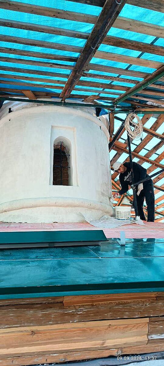 Также завершается монтаж кровли храма — кровля обшивается оцинкованным железом, окрашенным в традиционный зелёный цвет. Ранее был установлен и обшит оцинкованным железом сам купол.
