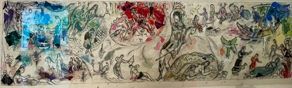 1967–1969 Франция, Ницца, факультет права и экономических наук 2 января 1967 года Луи Тротабас, декан юридического факультета Ниццы, предложил Марку Шагалу создать произведение для украшения вестибюля нового кампуса. Этот центральный зал, выходящий к морю и символически напоминающий античный форум, стал естественным местом встреч и студенческой жизни. По предложению декана была выбрана тема Одиссея, вдохновлённая эссе Габриэля Одизио «Одиссей, или интеллект» (1946). Она в полной мере выражала послание, которое Шагал хотел оставить новому поколению: гимн средиземноморскому гению и универсальному человеку, побеждающему жизненные испытания мудростью и разумом. Мозаика была выполнена Лино и Хайди Мелано в мае 1968 года. Это монументальное произведение стало вершиной их технического мастерства и идеально воплотило утончённый замысел Шагала. Яркие оттенки и световые рельефы достигают кульминации в сиянии золотых и серебряных тессер, которыми облачён Одиссей в «одежду света». В центр