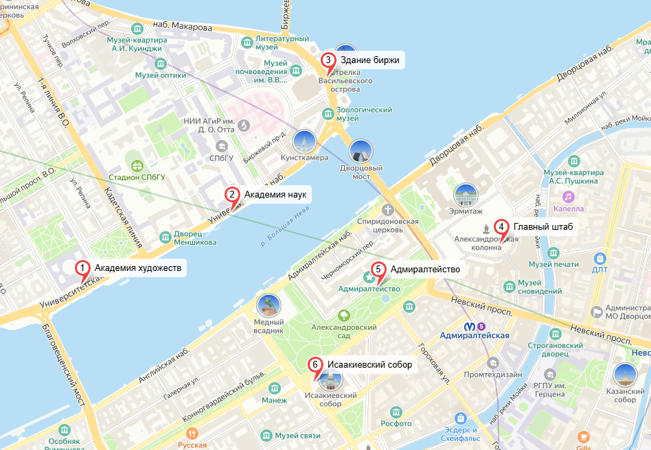 Начинаем на Васильевском острове. Можно доехать станции метро «Василеостровская», затем идем по 6-й линии до Большой Невы к Академии художеств.