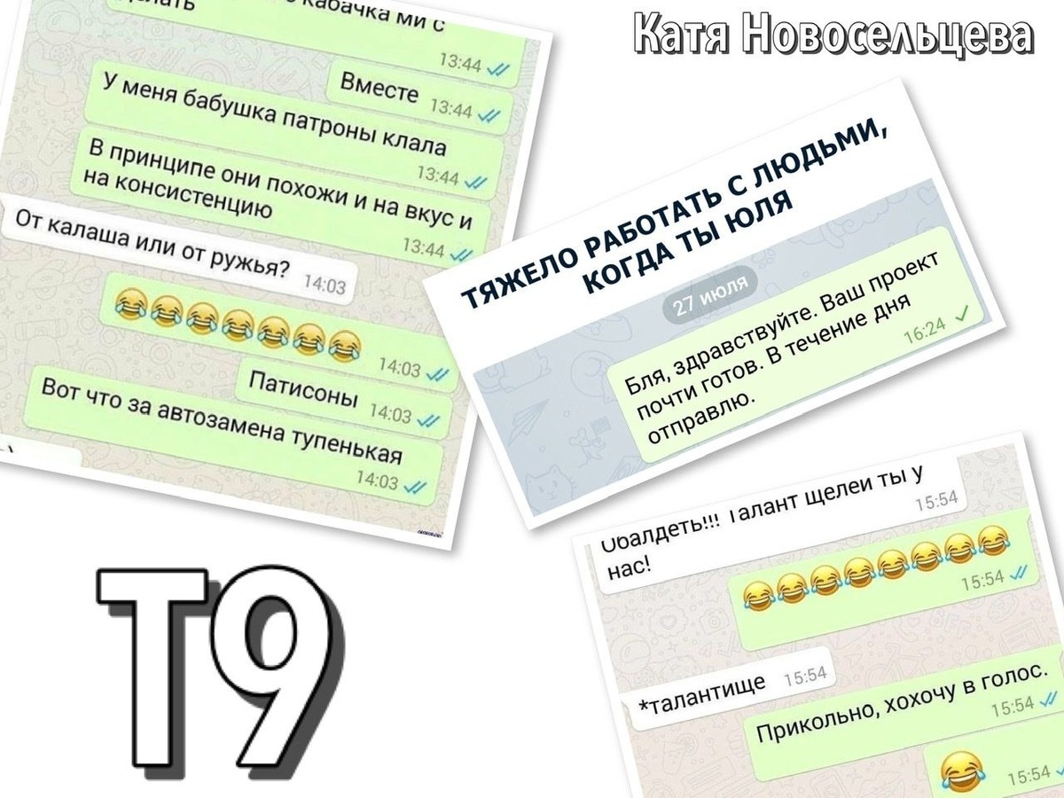 Т9 Катя Новосельцева Умом Т9 не понять. И без ста грамм не разобраться. Что здесь хотел я написать? Хочу я плакать и смеяться… Возьмём классический пример, Когда ты пишешь мат. Не имя. Т9 – это просто зверь! На «Юлю» часто аллергия. «Талант щелей» – «талантище». «Патроны» вместо «патиссонов». Ну это жесть, товарищи! Какой-то шифр, а не слово! 16.09.2023 19:00