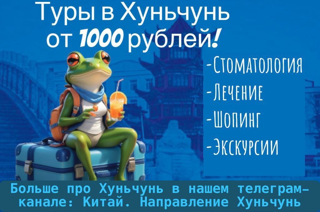 -Лечебные и стоматологические туры в Хуньчунь от 1000₽!!! -Экскурсионные туры от 8500₽! -Выезды каждый день -Быстрое прохождение границ -Договор и страхование -Принимаем туристов со всей России 📞За подробностями пишите нашему менеджеру 89146896285 Елена. Для звонков 89662808686 ✅Еще больше про Хуньчунь на нашем канале: https://t.me/hunchunburg С нами интересно☺️ 🪷
