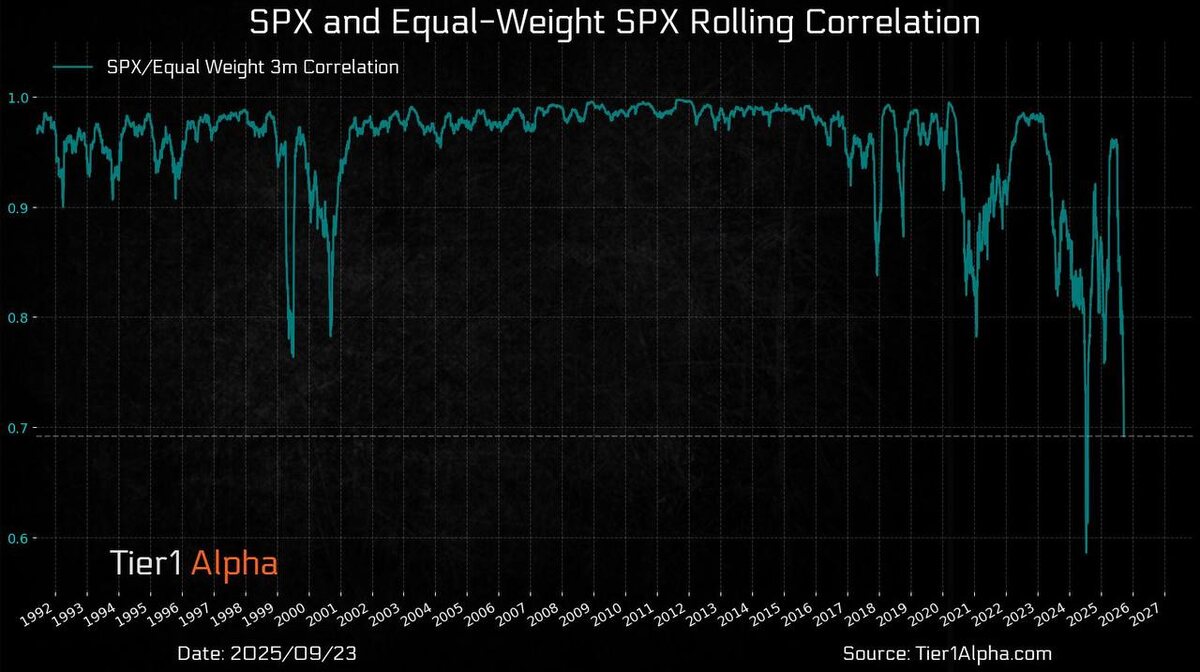 Рынок держится на плечах гигантов А вот тут совсем другая картина. На графике — корреляция S&P500 с его равновесной версией (equal-weight). И мы видим, что сейчас она рухнула к уровням, которые бывали лишь в редкие кризисные моменты. Что это значит? Большая часть индекса не идёт в ногу с его «топами». Корреляция падает, потому что рынок тащат буквально несколько компаний — «магниты», которые перекрывают слабость остальных. Это классическая картина перед разворотами: ширина рынка сужается, масса акций буксует, а индекс за счёт тяжеловесов рисует красивые вершины. Так было перед дотком-баблом, так было перед кризисом 2008. И снова мы видим ту же декорацию. На что стоит обратить внимание ‼️ — Чем ниже корреляция, тем выше концентрация риска. — Когда «локомотивы» начнут остывать, индекс окажется без поддержки. — Для крипты это сигнал тоже важный: перегретый Nasdaq и S&P всегда рано или поздно влияют на приток ликвидности. Ключевая мысль: цикл всё расставит — и ширина рынка всегда