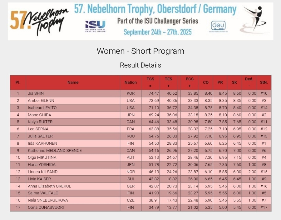 На этом состязании, которое проходит в немецком Оберсдорфе, есть возможность посмотреть в какой форме находятся американские и японские фигуристки. Алису Лью мы уже видели на прошлом турнире - ни формы, а теперь и программы толком нет (вынуждена сменить музыку). Эмбер Гленн выступила раньше своих конкуренток. Ажурное платье тёмно-вишневого цвета, золотые цепи на шее, аки у царицы Египта Клеопатры, прическа - все очень гармонично и ей подходит. Немного визуально ей мешают перетяжки на рукавах. Ну а слова из песни Мадонны ей тоже близки. Начала с тройного акселя. Затем каскад из тройного флипа и тройного тулупа, тройной риттбергер почти без выезда. После всех прыжков уже подняла голову ото льда и заулыбалась, отжигая хореографическую часть. Очень уверенное и эмоциональное выступление. Оценка - 73.69 балла и она занимает лидирующее положение. Действительно хорошо подготовилась к сезону. Ей важно с ходу заявить о своих лидирующих позициях. У них отбор в сборную идёт с учётом предыду