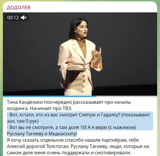 Судя по всему, на поезде в ад к чёртовой бабушке катится не только радио-бизнес Газпром-Медиа, но и телевизионный: Тина Канделаки поочередно рассказывает про каналы холдинга. Начинает про ТВ3: - Вот, кстати, кто из вас смотрит Слепую и Гадалку? (показывают зал, там 0 рук) - Вот вы не смотрите, а там доля 10! А я верю (с нажимом) Руслану Тагиеву и Медиаскопу! - заметил Евгений Додолев НТВ много лет не может забраться на пик 10ки рейтинга, если и взлетает что-то - это политика или сериалы про бандитов. Бывают недели, когда в ТОП-10 по стране все 10 мест занимает Россия 1, вот, пожалуйста. И с цифровыми активами у них полная катастрофа, оказывается, у них был даже лейбл Yappy Music, который закрыли и забыли сразу после его запуска, и т.н. артисты разбежались, как мыши по углам Ещё и на Матч ТВ движуха какая-то неспортивная. Продали комсомольцы родину, растащили по зарубежным дачам "национальное достояние"… А ведь могло получиться что-то серьёзное, на такие то триллиарды. Где, что и