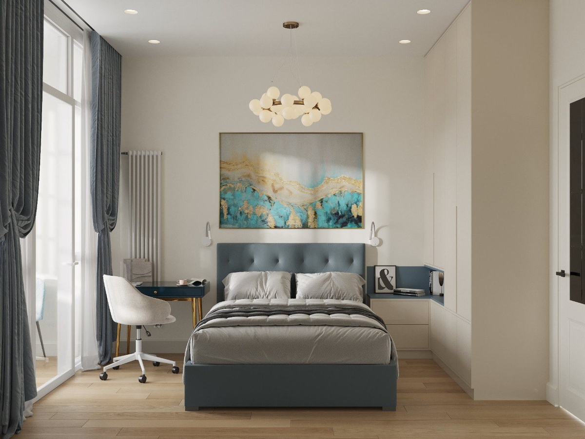 В центре комнаты расположена двуспальная кровать с синей обивкой — это основной акцент в интерьере