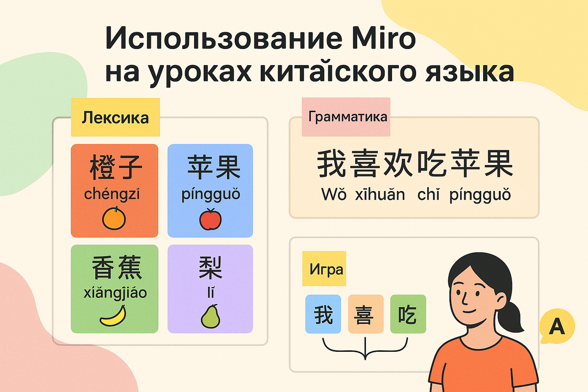 Современные уроки китайского языка — это не только учебники и карточки. Учителям и репетиторам хочется делать занятия яркими, живыми и интерактивными. Один из лучших инструментов для этого — Miro ✨. Miro — это онлайн-доска, где можно создавать схемы, карточки, игры и даже целые уроки. Она идеально подходит для индивидуальных занятий, групповых уроков и онлайн-обучения. Вот несколько примеров, которые можно использовать прямо на занятиях: 👉 Отлично подходит для тем: «Еда 🍜», «Животные 🐼», «Цвета 🌈». 💡 Miro превращает уроки китайского языка в яркое визуальное приключение, где иероглифы становятся не сухими символами, а живыми элементами игры и общения. 1. Collaborative Language Learning Game Template
