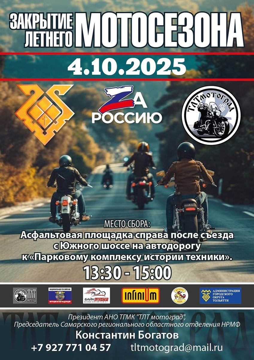 🔁 Дальняк.рф™: ПЛАН МЕРОПРИЯТИЯ «Закрытие летнего мотосезона в г.Тольятти 4 октября 2025 г.» Требования к участникам и условия их допуска. К мероприятию допускаются мотоциклисты, имеющие водительское удостоверение установленного образца, на чистом транспорте (мотоциклы, максискутеры, трициклы), зарегистрированном в установленном порядке с читаемыми государственными номерами. Наличие мотошлема у водителя и пассажира — обязательно. Приветствуется наличие на мотоциклах закреплённых надёжно и безопасно флагов: в поддержку «специальной военной операции» на Украине, с государственной, военной Российской, Советской, городской и мотоклубной символикой. Водители квадроциклов к участию в мероприятии не допускаются. Движение по «Парковому комплексу истории техники имени Сахарова К.Г.» со скоростью не более 5 км/ч. На месте сбора после прибытия и до начала движения находится с заглушенными двигателями, соблюдая тишину. Не оставлять после себя мусор. Организатор вправе отстранить мотоциклиста о