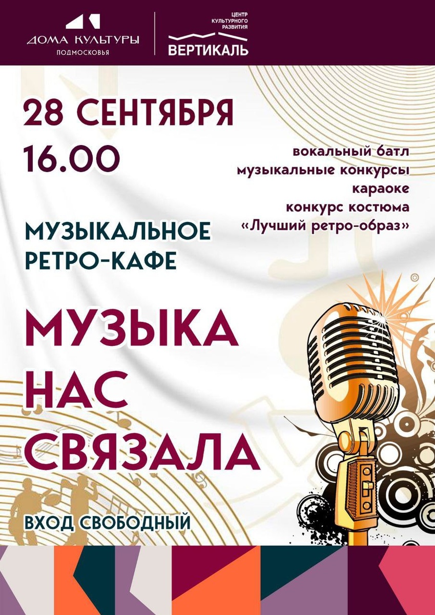 ✨ Музыкальное ретро — кафе «Музыка нас связала» 🎤Вы можете стать не только зрителями, но и участниками вокального батла, исполнить песни под караоке. Вас ждут музыкальные конкурсы, а также конкурс костюма «Лучший ретро-образ»👒. 🚫 Возраст: 12+ 📆 28.09.2025 🕒 16:00 🏢 ЦРК "Вертикаль" г. Пущино 📍 г.о. Серпухов, г. Пущино, проспект Науки, 7 💰 Вход свободный❗️ ⭐Поддержать канал голосом 💰 Вакансия - курьер в Серпухове ✅ Мероприятия Серпухов https://dzen.ru/id/66f01c6eb4c6fe60c9ca1608 http://vk.com/serpukhov_events http://dzen.ru/serpukhov_events