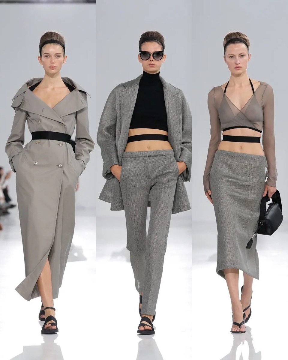Показ Max Mara на миланской Неделе моды проходил в историческом павильоне, где свет отражался в зеркальных подиумах. Креативный директор Иэн Гриффитс в этот раз решил столкнуть два мира: воздушную роскошь эпохи рококо и дерзкий минимализм 1980‑х. В интервью дизайнер подчеркнул, что не стремился создавать костюмную драму — ему хотелось представить современную женщину, свободно играющую с историческими кодами. Коллекция открылась бежевыми и карамельными оттенками, характерными для ДНК Max Mara, но дальше палитра обогащалась «призрачными» флоральными и подводными принтами, словно будто видимыми сквозь туман . Основным контрастом стали резкие чёрные аксессуары и ремни-резинки, напоминающие о фетиш‑культуре. Цветовая гамма от нежных пастелей до глубокого антрацита отдавала пряным розовым и жемчужным переливам, а серебристые детали отсылали к эпохе Дэвида Боуи и его альбома «Scary Monsters» . Силуэты сочетали романтику и строгость. Облегающие платья‑колонны с голыми плечами и спиной сосе