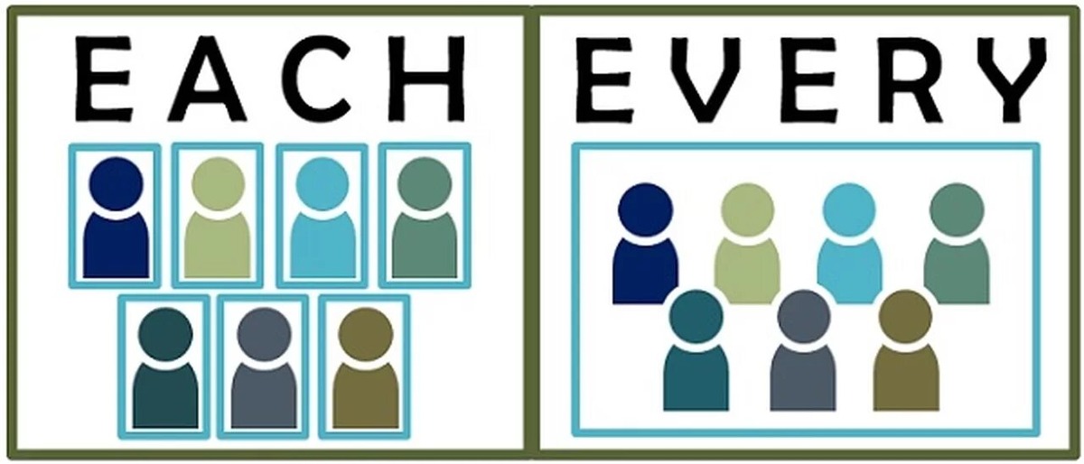 - Each = индивидуальность, отдельность, подходит для групп любого размера.