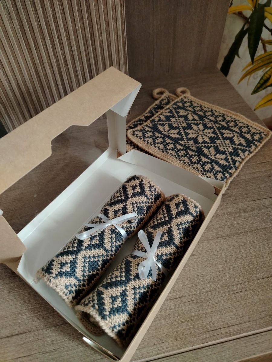 Прихватки связаны из шерсти переплетением орнамент. Плотные, мягкие, легко стираются, быстро высыхают.