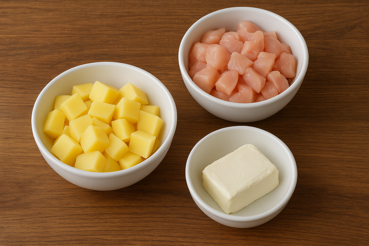 - Подготовка. Нарежьте куриное филе небольшими кубиками. Картофель — чуть крупнее, чтобы не разварился. Морковь и лук можно натереть или порубить мелко — как любите.