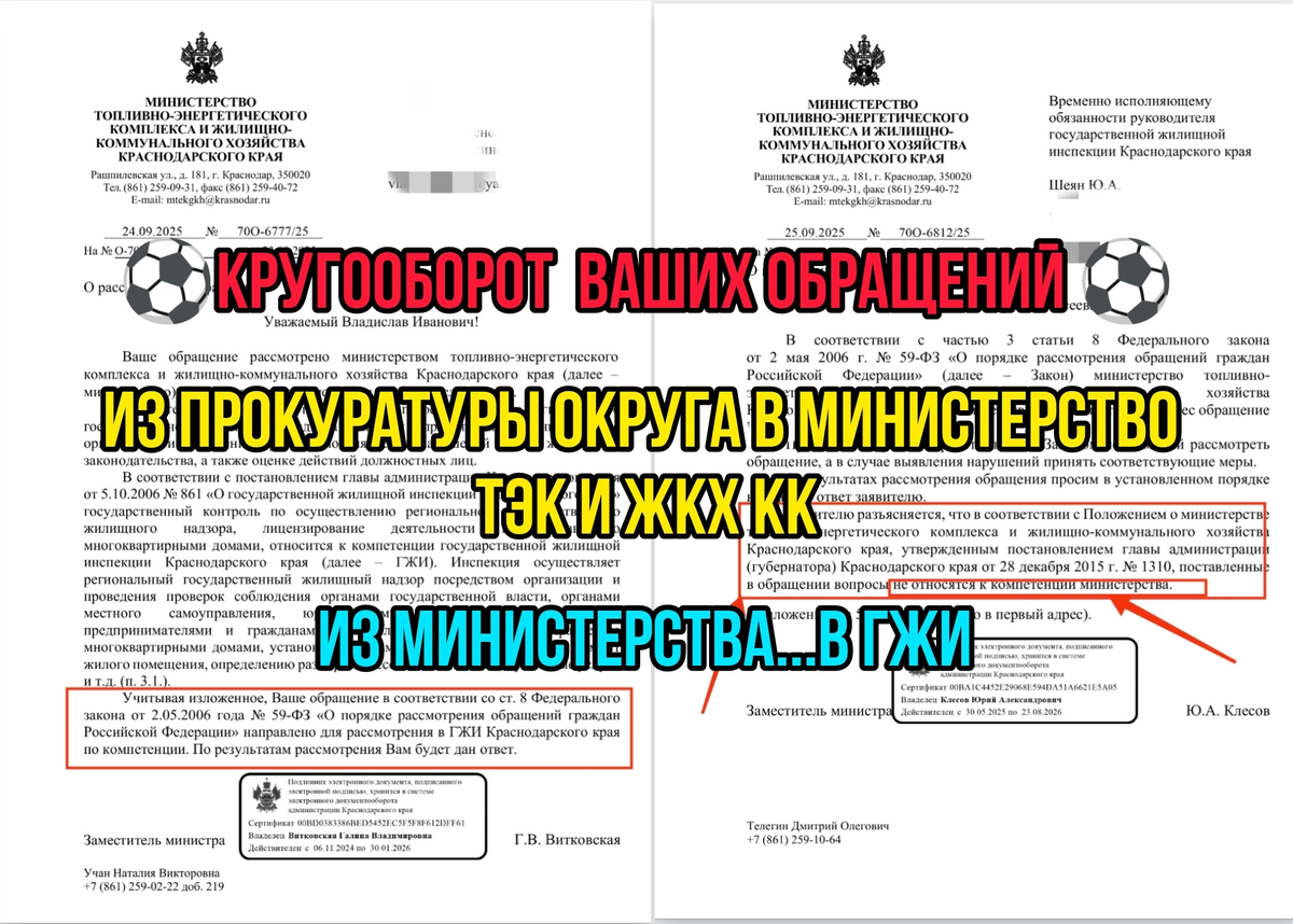 Так, 25 сентября 2025 года на свой адрес электронной почты я получил ответ из Министерства топливно-энергетического комплекса и жилищно-коммунального хозяйства Краснодарского края (исх. № 700-6777/25 от 24.09.2025 на моё обращение № О-70/812 от 23.09.2025).