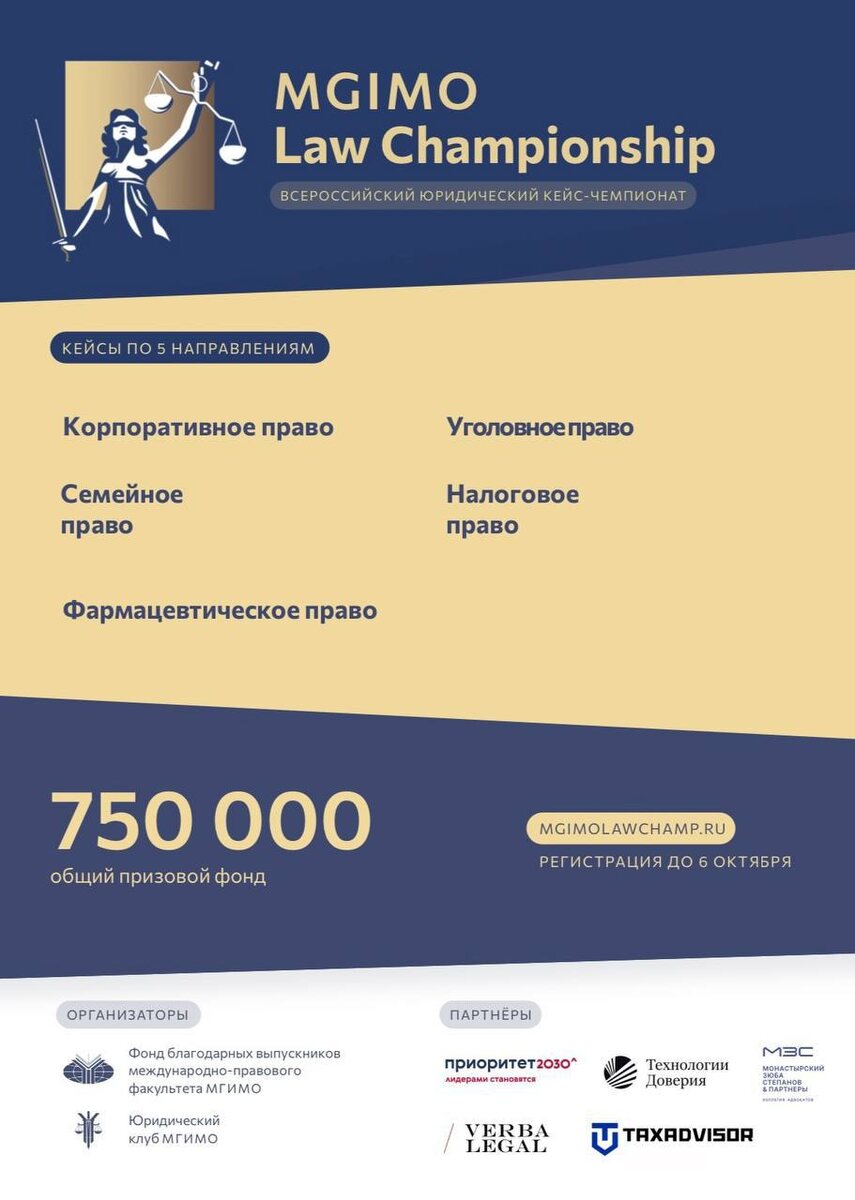 😀 Будет интересно студентам: мероприятие наших партнеров! 😀 Друзья, мы рады сообщить, что открыта регистрация на Всероссийский юридический кейс-чемпионат MGIMO Law Championship 2025, в рамках которого предполагается решение кейса по одному из 5 направлений: 😀Корпоративное право 😀Семейное право 😀Фармацевтическое право 😀Уголовное право 😀Налоговое право 😀Кейс-чемпионат пройдет в 2 этапа: заочный этап с 7 по 13 октября и очный этап 25 ноября в МГИМО. В очном этапе примут участие 5 команд-финалистов по каждому направлению. 😀Зарегистрировать свою команду можно до 5 октября 2025 года 23:59 по московскому времени. 😀Форму заявки, а также подробную информацию об условиях участия, партнерах мероприятия и призах можно найти на сайте чемпионата: Подать заявку