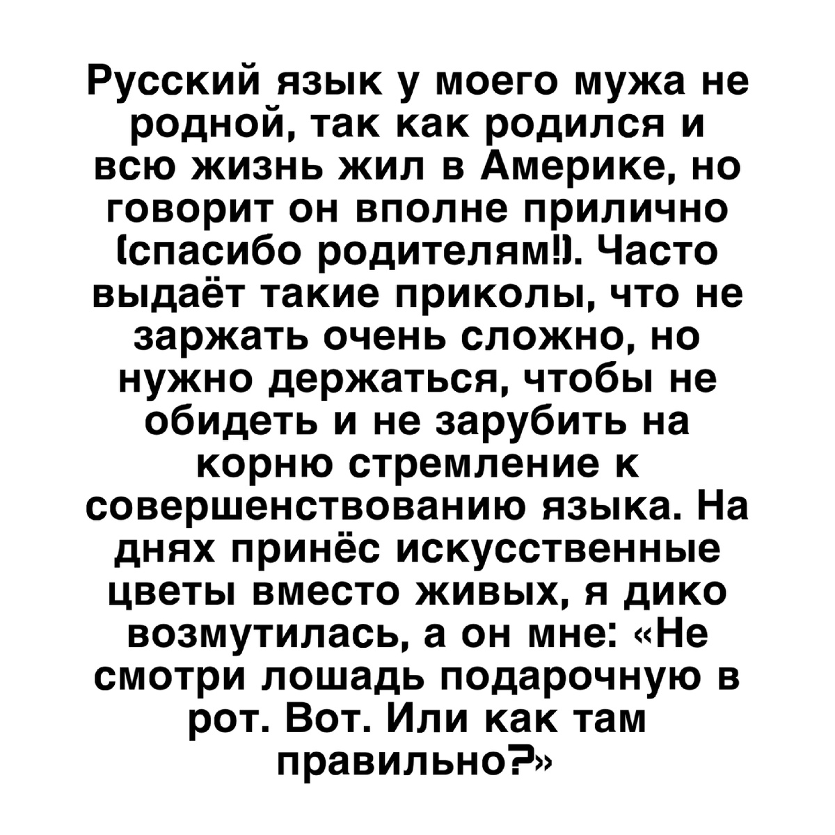 Русский язык у моего мужа не родной, так как родился и всю жизнь жил в Америке, но говорит он вполне прилично (спасибо родителям!). Часто выдаёт такие приколы, что не заржать очень сложно, но нужно держаться, чтобы не обидеть и не зарубить на корню стремление к совершенствованию языка. На днях принёс искусственные цветы вместо живых, я дико возмутилась, а он мне: «Не смотри лошадь подарочную в рот. Вот. Или как там правильно?»