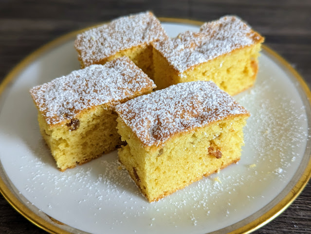 Взбейте миксером. Добавьте яйца по одному и продолжайте перемешивание. Влейте молоко, подсыпайте оба вида муки, разрыхлитель, соду, ванильный сахар и цедру. В самом конце вводите промытый и немного просушенный изюм. Выложите готовое тесто в противень размером 23х23 см, застеленный бумагой для выпечки, и слегка разровняйте. Выпекайте в предварительно разогретой духовке (верхний/нижний нагрев 180°C) около 25 минут. Проверьте готовность зубочисткой. Готовый пирог переложите на решетку, используя бум