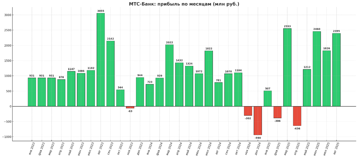 Около месяца назад я расписывал инвестиционную идею в МТС-Банке. Аргументы расписывал подробно, подкрепляя цифрами отчетности за второй квартал: Хоть саму идею я дал в начале августа, но для детального обоснования решил подождать выхода отчета. И он подтвердил интерес. Учитывая общее падение рынка, котировки МТС-Банка также снизились. Сейчас бумагу можно купить за 1269 рублей. Это всего 0,4 капитала (p/b) и около 4x по показателю p/e (25). Отличная возможность снова представляется. К тому же, ЦБ опубликовал отчетности банковского сектора по РСБУ за август. МТС-Банк выглядит молодцом и показывает один из лучших результатов. Так в августе было заработано 2,395 млрд рублей. Это в три раза (!) больше, чем годом ранее. По восьми месяцам результат примерно сопоставимый с 2024 годом - около 10 млрд рублей. И это при том, что практически всю первую половину ключевая ставка была равна 21%, а год назад - всего 16%. МТС-Банк постепенно выходит на >2 млрд рублей прибыли в месяц. Однако по МСФО